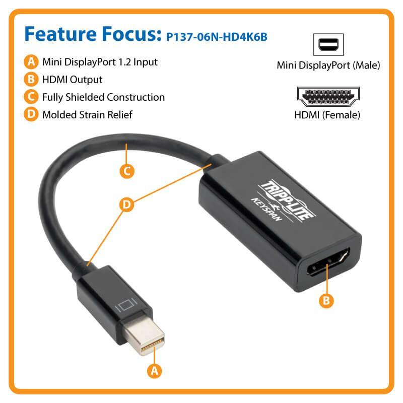 Este adaptador Mini DisplayPort a HDMI le permitirá enviar vídeo y audio HDMI de salida desde un dispositivo Mini DisplayPort, compatible con Ultra HD 4K a 60Hz. El adaptador Mini DisplayPort es el accesorio perfecto para su dispositivo Microsoft Surface™ Pro con Mini DisplayPort. El adaptador le permite aprovechar al máximo las capacidades de vídeo integradas en su conexión Mini DisplayPort, a fin de ofrecer la asombrosa calidad de imágenes UHD a su pantalla 4K 60Hz. Esto facilita el trabajo multitarea, ya que se utilizan varios monitores para trabajar con aplicaciones que requieren un uso intensivo de recursos. A diferencia de muchos adaptadores 4K Mini DisplayPort a HDMI que son compatibles solo con frecuencias de barrido de 30Hz, este adaptador funciona con pantallas HDMI 2.0 que ofrecen resoluciones de salida de hasta 3840 x 2160p a 60Hz. La compatibilidad con HDMI 2.0 significa que este adaptador es compatible con un ancho de banda de hasta 18Gbps, lo cual lo convierte en la solución ideal para tareas de alta resolución, como la edición de vídeo 4K.