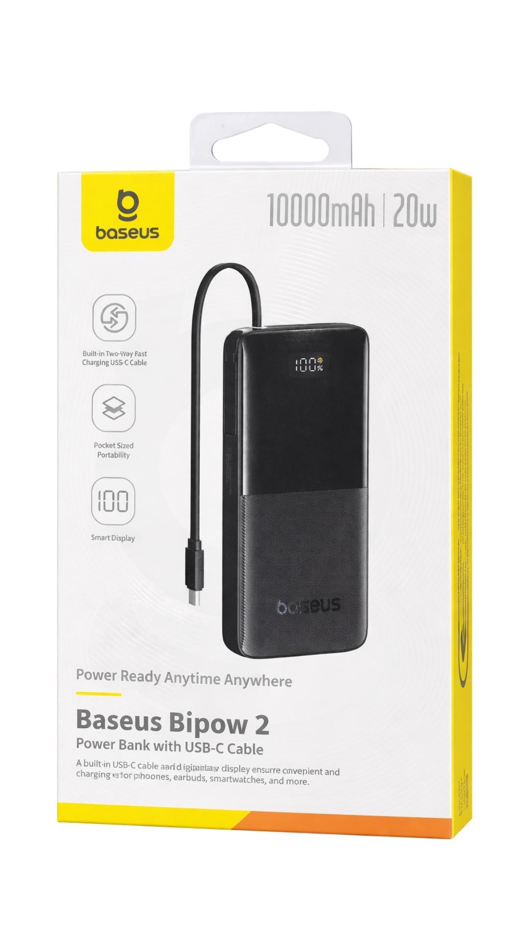La batería externa Baseus Bipow 2 de 10000 mAh combina potencia, practicidad y diseño compacto para mantener tus dispositivos siempre cargados. Con una capacidad de salida de 20W, ofrece carga rápida y eficiente, ideal para smartphones, tablets y otros accesorios compatibles. Su cable USB Tipo-C integrado facilita la conexión inmediata sin necesidad de llevar cables adicionales, brindando comodidad y portabilidad. Fabricada en color negro con un acabado moderno y elegante, esta power bank destaca por su diseño ergonómico, tamaño reducido y peso ligero, perfecta para viajes, trabajo o uso diario.